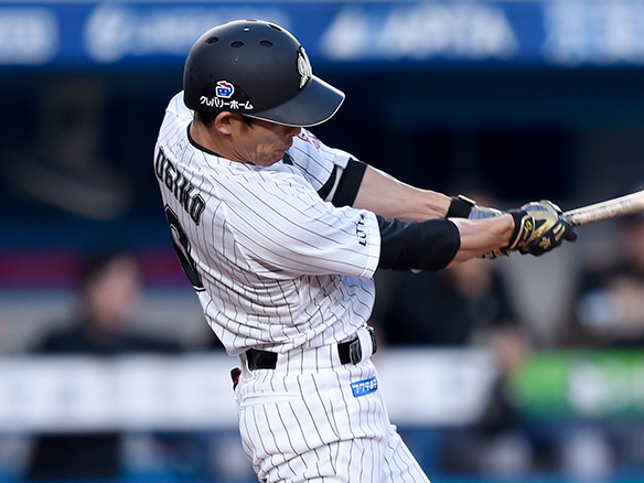 1番 荻野貴 左安 外角のチェンジアップをレフトへ打ってヒット 1塁 |