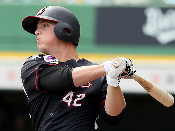 投手 山岡 9番 田村 三安 外角のカットボールをサードへ打ってヒット 1塁 |