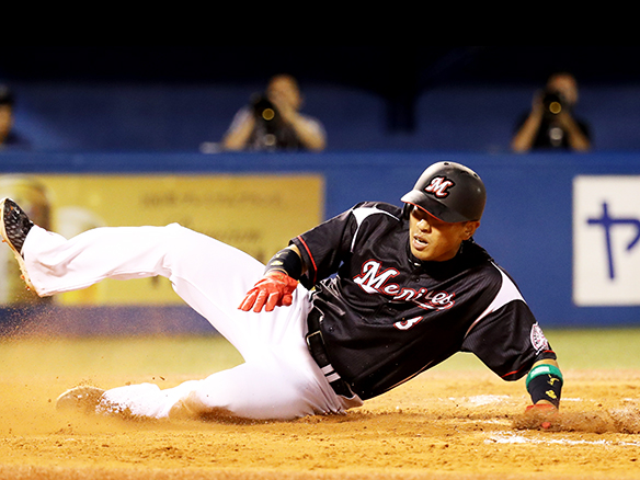 角中が1塁から一気に本塁に生還し、3点目のホームを踏む