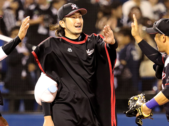 試合に勝利し、好投した石川が選手たちを出迎えた