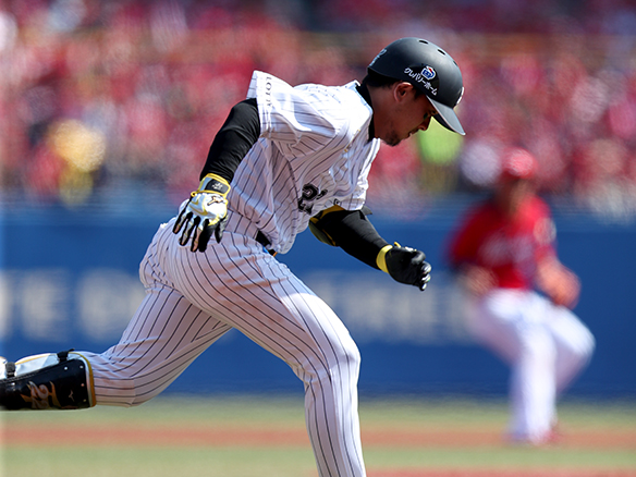 田村の全力疾走が相手のミスを誘い出塁する