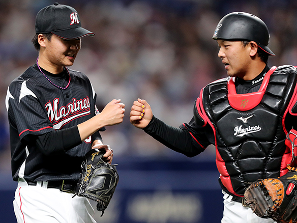 3者連続でゴロに打ち取り田村とグータッチをする渡邉