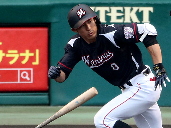 絶妙なセーフティバントで1、3塁と好機を広げる荻野貴