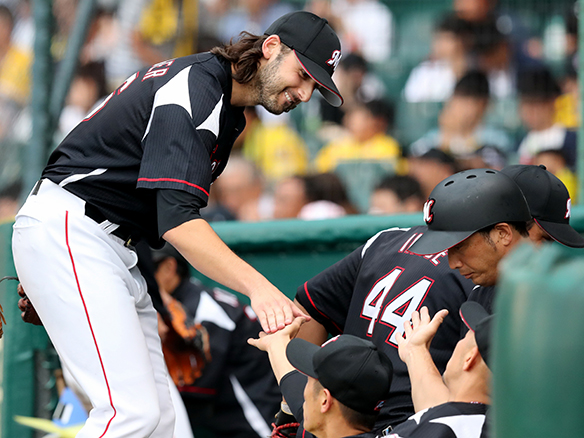 9番 ボルシンガー 空三振 外角低めのスライダーを空振り三振 3アウトチェンジ |