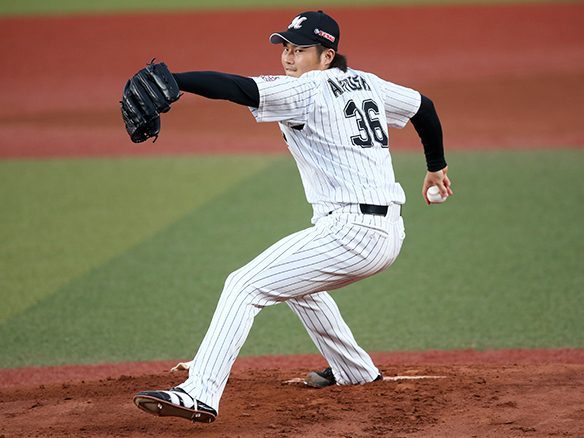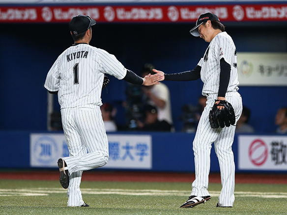 投手 有吉 投手 益田 守備変更:岡田→ライト 守備変更:加藤→レフト 守備変更:益田→ピッチャー |