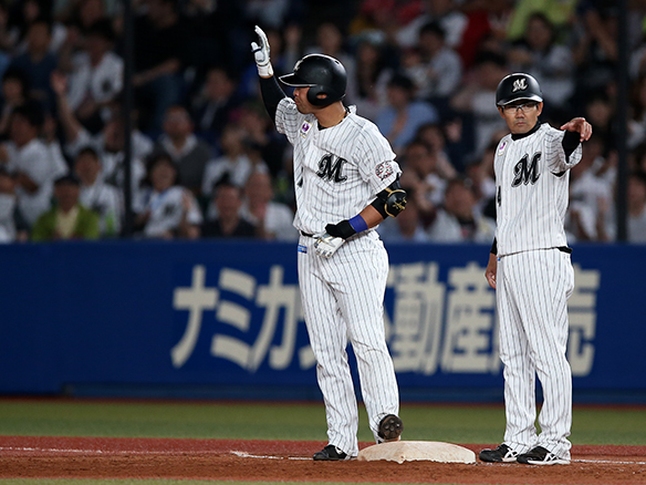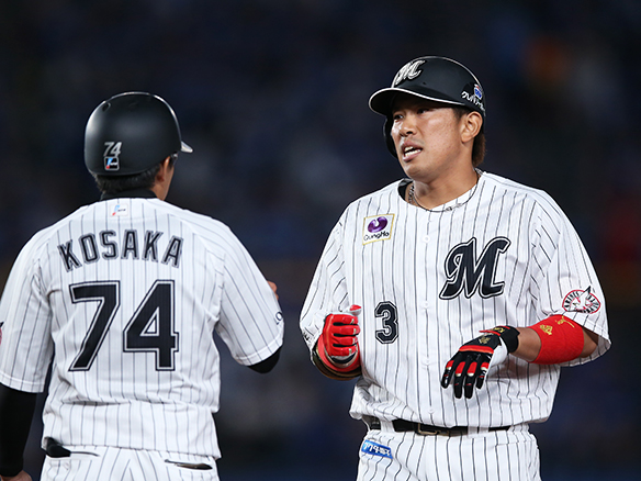 勝ち越し打を放ち角中は1塁上で安堵の表情