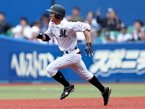 荻野貴は俊足を活かし左中間への安打で2塁まで進む
