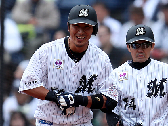 4番 角中 四球 フォアボールを選ぶ 1塁 |