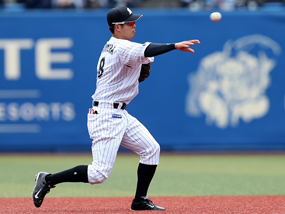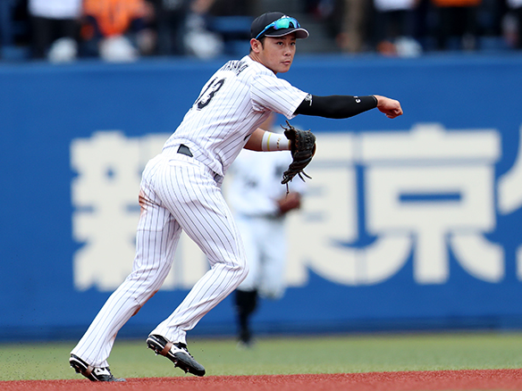 1番 荻野貴 遊ゴロ 外角高めのチェンジアップを打つもショートゴロ 2アウト |