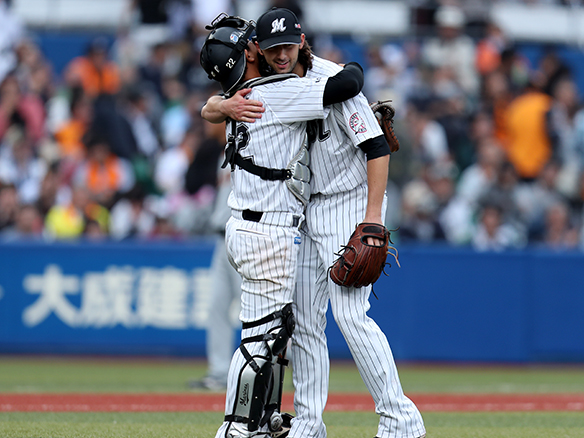 見事完封を成し遂げ田村と喜び合うボルシンガー