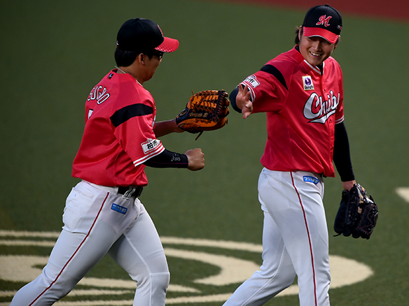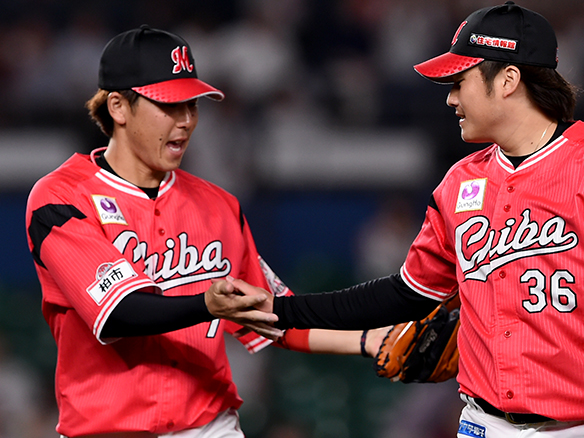 勝ち越しのピンチを抑えた有吉が鈴木とタッチを交わす