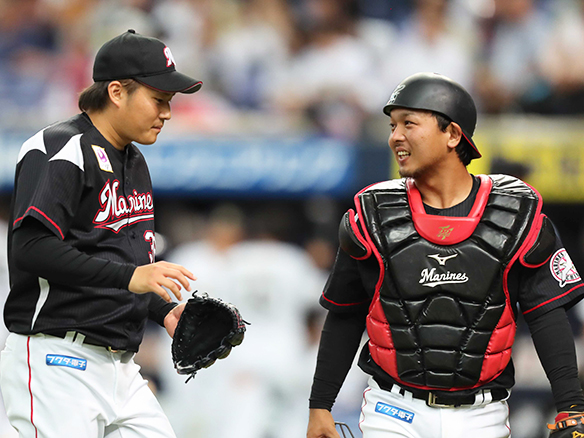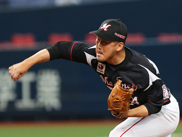 投手 金子千尋 3番 中村 右邪飛 ファウルフライをロメロ(右)が捕球してバッターアウト 1アウト |