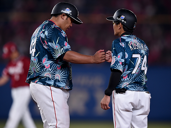 四球を選び出塁した井上は小坂コーチとグータッチ