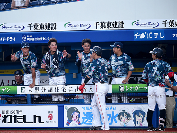 同点に追いつきハイタッチを交わすナイン