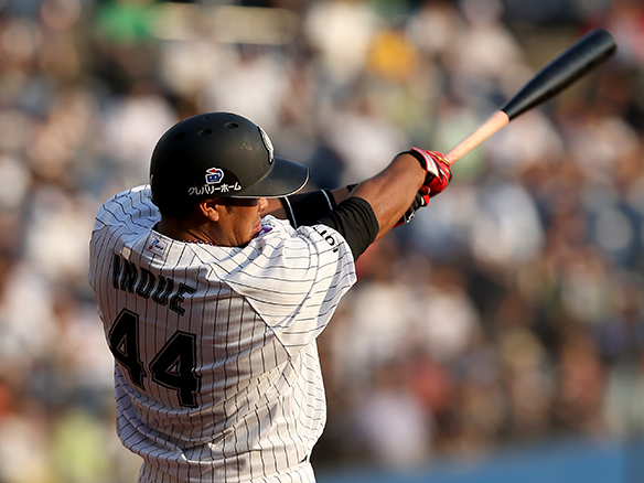 7番 福浦 中安 ランナー1,3塁 外角低めのフォークをセンターへ勝ち越しタイムリーヒット! 1,3塁 ロ3-2オ ![]() 3