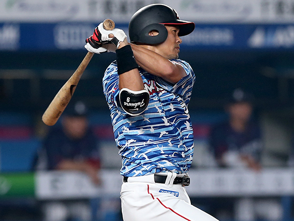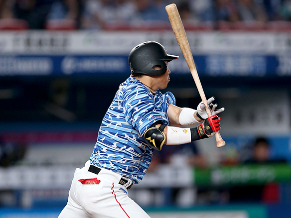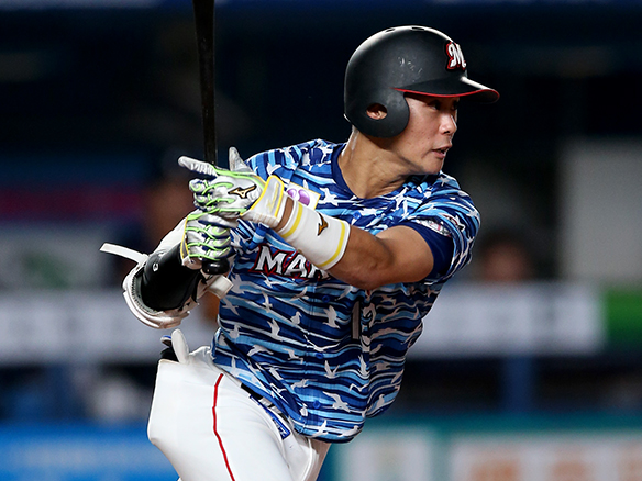 この回先頭の藤岡裕が左中間への二塁打を放つ