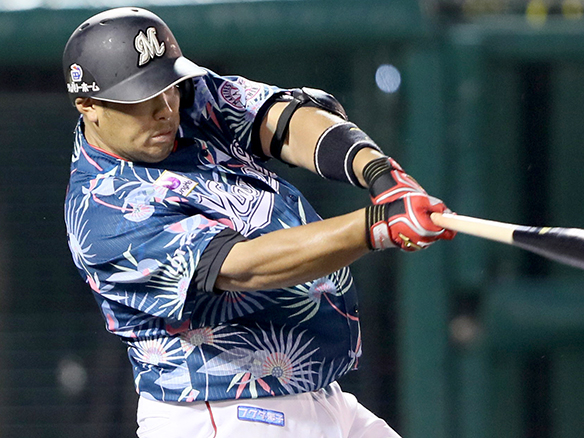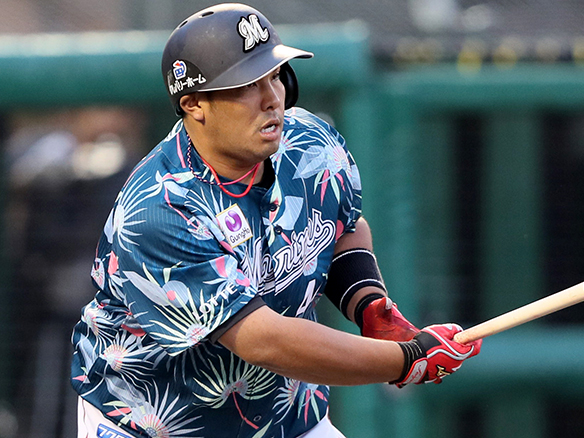 4番 井上 左安 ランナー1,2塁 外角低めのカーブをレフトへ先制タイムリーヒット! 1,2塁 楽0-1ロ ![]() 0