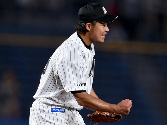酒居は相手打者を三振に抑えガッツポーズ