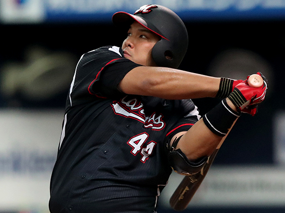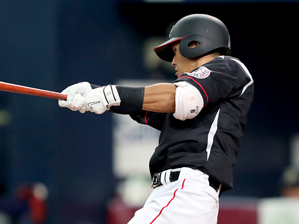 井上が高めの直球を振り抜きフェンス直撃の二塁打を放つ