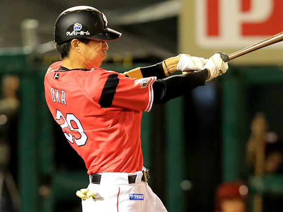 投手 近藤 1番 岡 中安 高めのストレートをセンターへ打ってヒット 1塁 |