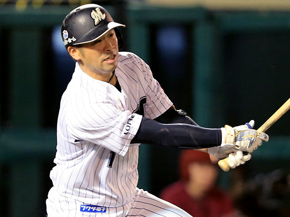 7番 嶋 左安 ランナー1,2塁 ど真ん中のストレートをレフトへタイムリーヒット! 1,3塁 楽5-0ロ ![]() 5