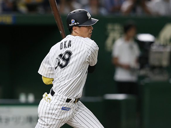 1番 岡 中安 満塁 外角低めのストレートをセンターへ同点タイムリーヒット! 1,3塁 ロ2-2西 ![]() 2