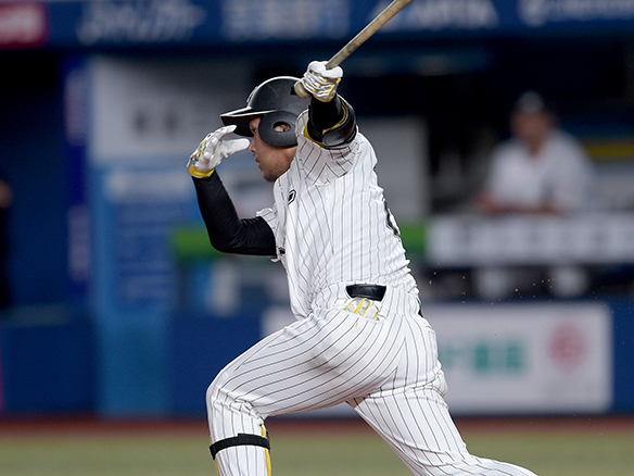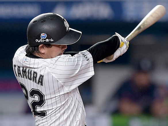 田村が左前安打を放ち出塁する。