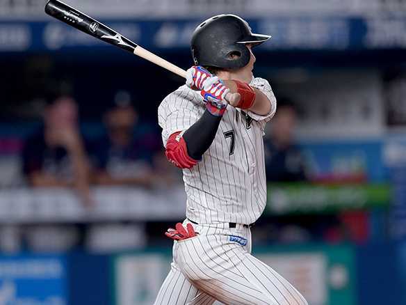 9番 金子侑 左安 満塁 外角高めのストレートをレフトへタイムリーヒット! 1,2塁 ロ1-4西 ![]() 1