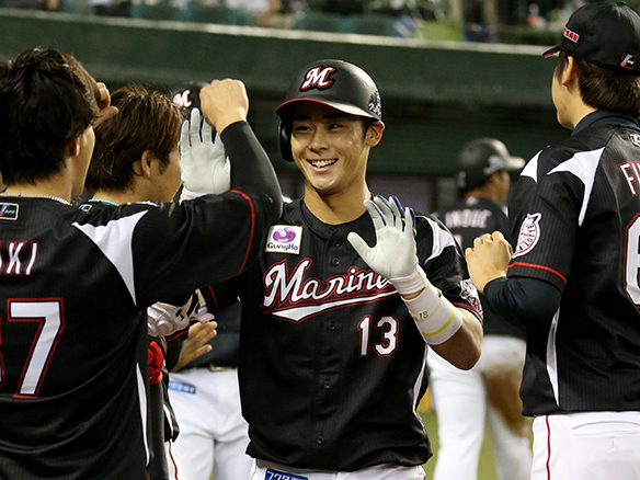 清田の先制適時打で生還した井上がベンチに迎えられる