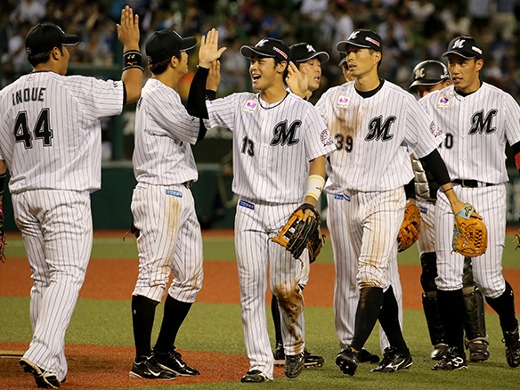 内が最後を締め、勝利のハイタッチをかわすナイン