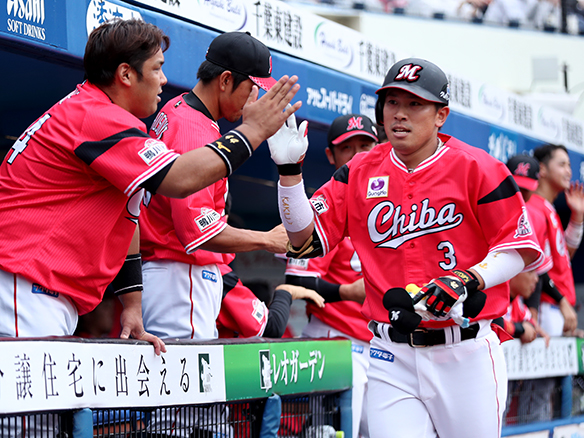 ソロ本塁打を放った角中はベンチでナインとハイタッチ