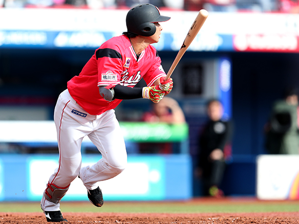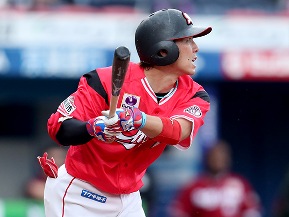 5番 銀次 二安 ランナー2塁 外角低めのフォークをセカンドへ打ってヒット 1,3塁 |