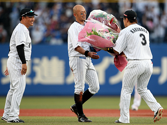 福浦が通算2000本安打を達成し、井口監督と角中は笑顔で祝福する