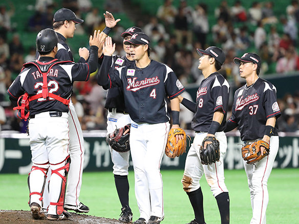 連敗をストップ!勝利してハイタッチする千葉ロッテナイン