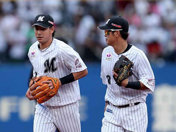 併殺を奪ってベンチに戻る中村と藤岡裕