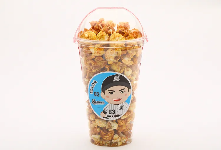 和田選手のイラストシールで、見栄え良し、食べて良しの「絶品うま塩ポップコーン」です!