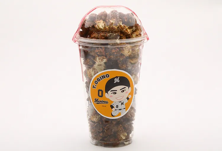 藤原選手のイラストシールで、見栄え良し、食べて良しの「絶品うま塩ポップコーン」です!