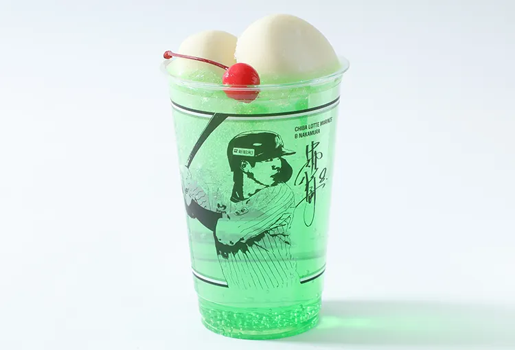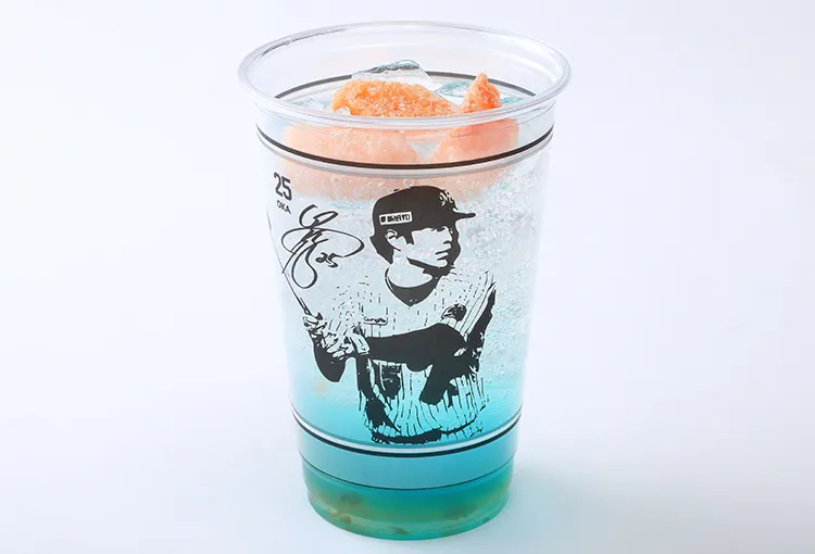 藤原選手の爽やかなイメージにぴったりの爽やかなブルーハワイソーダに雪見だいふくを乗せました。時間が経つと雪見だいふくのび~る!
