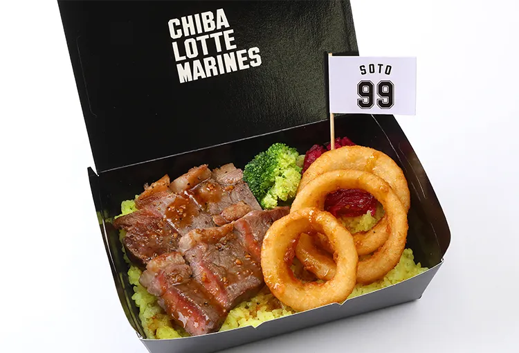 好評いただいたガーリックライスをリニューアル!佐藤選手の好きなガーリックライスにステーキを添えて仕上げ、ガーリックのパンチの効いた味が佐藤選手の勝負強さをイメージしました!