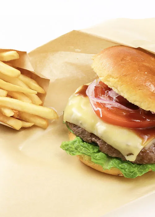 ボリュームたっぷりのオリジナルハンバーガーを是非ご賞味ください。別売りのポテトも一緒にどうぞ!