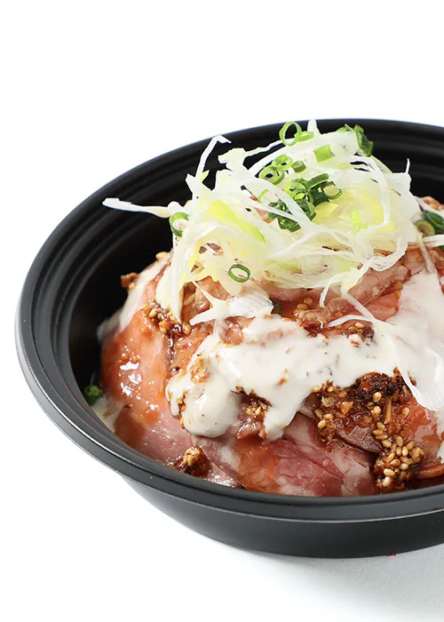 藤岡選手の好きな牛肉メニュー、アンガスビーフのカルビ肉を使用し醬油ベースの甘辛だれで焼肉丼にアレンジ!柔らかいお肉とボリューム感あるメニューに仕上げています!