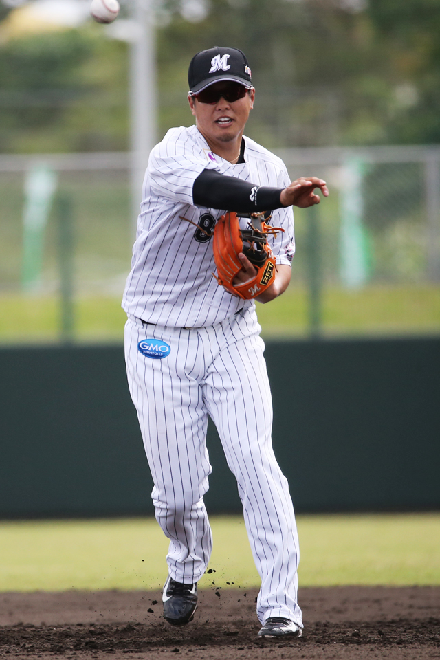 そのあとは内野手・外野手・捕手に分かれてノック。次々と放たれる打球をそれぞれのポジションで華麗にさばく連係を見せた内野陣は、一塁手に井上選手と高濱選手。二塁手に鈴木選手とパラデス選手。遊撃手に平沢選手と中村選手。三塁手に大嶺翔選手とダフィー選手。三木選手は二塁手と遊撃手の両方をこなしました。