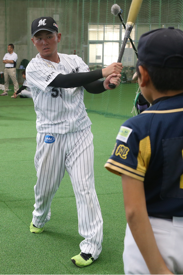 外野守備練習では柴田選手と角中選手がノッカーを務め、打撃練習を担当した加藤選手・肘井選手・三家選手は名札をつけた子どもたちの名前を呼んで楽しく指導。平沢選手・三木選手・大嶺翔選手は打撃指導のあと、食べ物の好き嫌いの話や質問コーナーを設けるなど、練習以外でも交流を図っていました。
