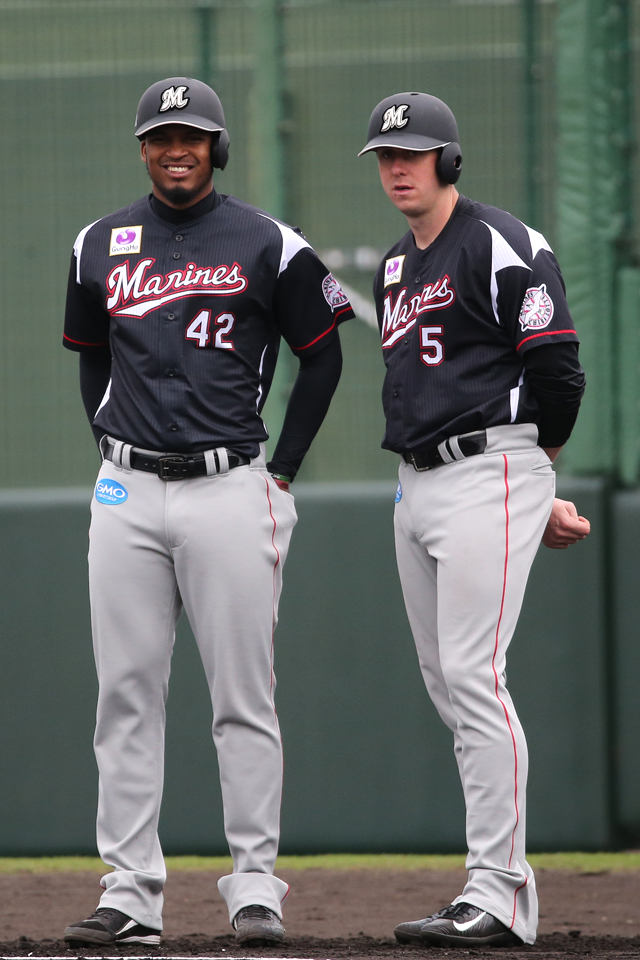 全員がビジターユニフォームとヘルメットを着用してバットを握り、試合同様の張りつめた空気がグラウンドを包みます。きちんと役割を果たした選手をグータッチで積極的に迎え入れる高濱選手、堀コーチの指導に真剣に聞き入る三家選手、岡田選手に走塁の質問をする柴田選手、通訳を介してルールを把握し懸命にプレーするダフィー選手とパラデス選手など、良いプレーには仲間同士で拍手を送りながら、活気ある練習が展開されました。終了後はマウンド付近に再度全員集合して反省会。コーチ陣からの言葉を各自しっかりと受け止め、このキャンプ初のゲームシチュエーションを終えました。