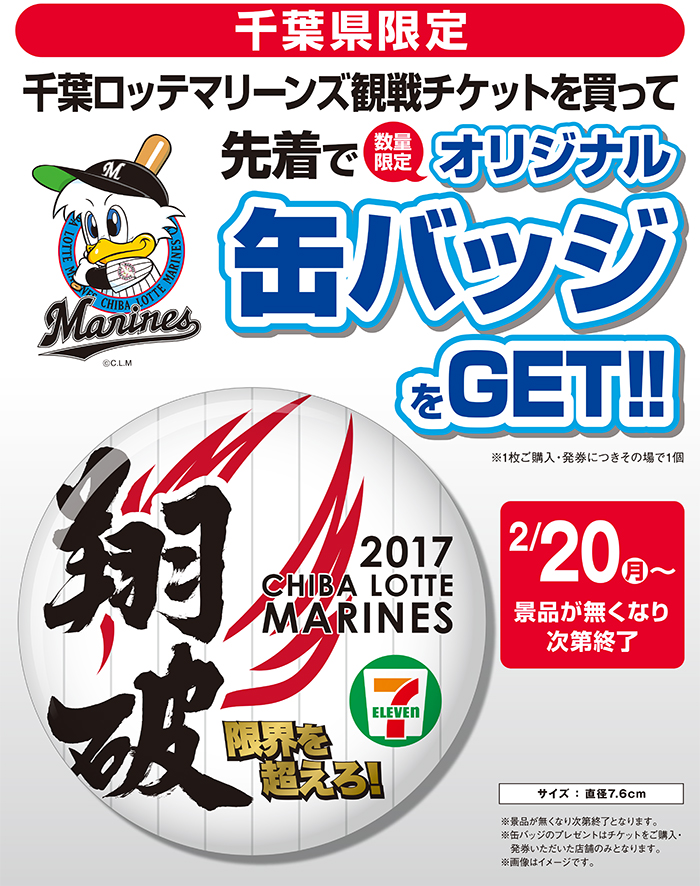 2月20日(月)より千葉県内セブン-イレブン各店舗にてZOZOマリン開催の千葉ロッテマリーンズ公式戦チケットを発券いただいた方に先着でオリジナル缶バッジをプレゼントいたします!!(プレゼントは各店舗予定数に達し次第終了となります。)