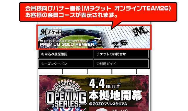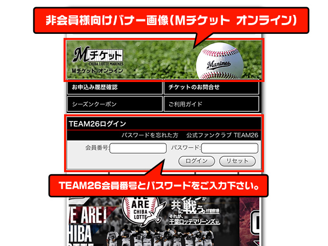 TEAM26会員の皆様のログインが手軽に!!TEAM26マイページを経由することなく、Mチケットオンライン(非会員チケット販売サイト)トップページより、「Mチケットオンライン TEAM26」にログインすることができるようになりました。