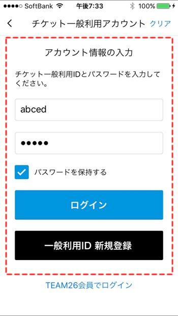 Mアプリ→チケット→TEAM26会員ではない方→チケット一般利用アカウント