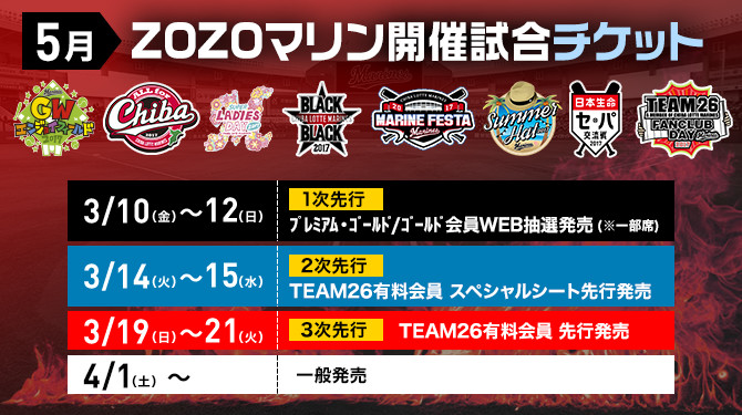 今シーズンZOZOマリンで開催される交流戦は、阪神戦・中日戦・東京ヤクルト戦の3カード!!今回のチケット販売では1カード目の阪神戦3試合が対象です。人気カードなのでお見逃しなく!!