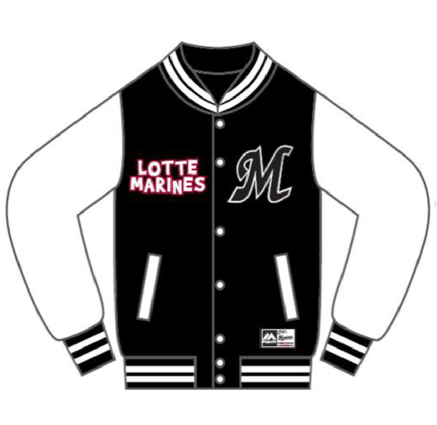 裾、袖口にマリーンズカラーのブラック・ホワイトをあしらい、レターマンジャケット特有の両脇に斜めに入るポケットがオシャレなスウェットジャンパーです。ブラック、グレーの2色をご用意しています。