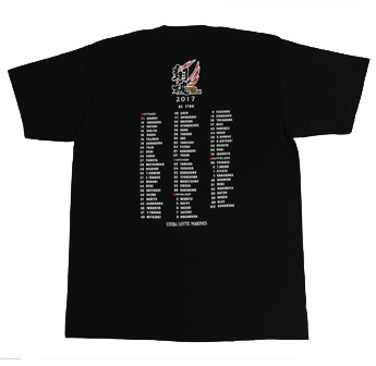 表にマリーンズのロゴ、裏面に2017年のチームスローガンと監督および所属全選手の名前がプリントされたTシャツです。